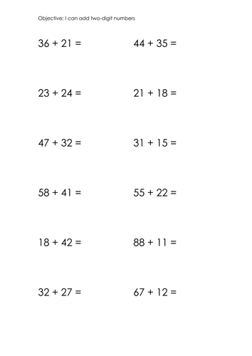 Our printable two digit addition worksheets contain 2 digit plus 1 digit numbers 2 digit addition drills addition with or without word problems addition with regrouping carrying or no regrouping missing digits and adding 3 4 and 5 addends.Adding two 2 digit numbers in columns no regrouping.Below are six versions of our grade 1 math worksheet on adding two 2 digit numbers in columns without carrying or regrouping.