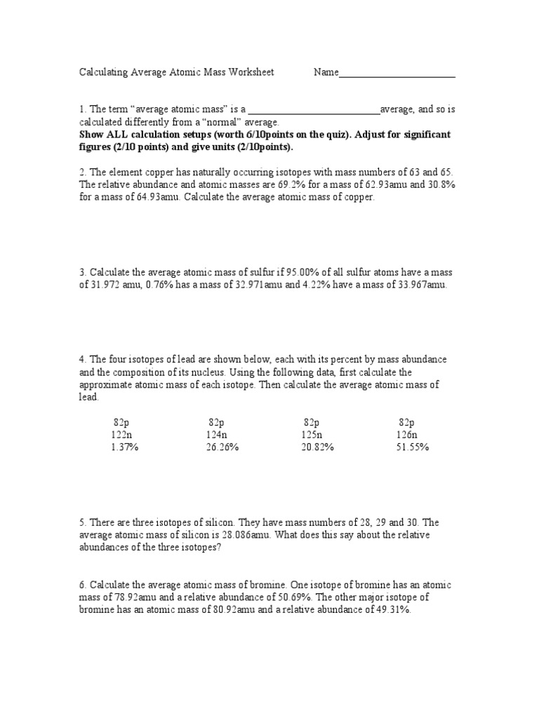Name average atomic mass worksheet.Calculating average atomic mass worksheet worksheet the term average atomic mass is a average and so is calculated differently from a normal average.The four isotopes of lead are shown below each with its percent by mass abundance and the composition of its nucleus.