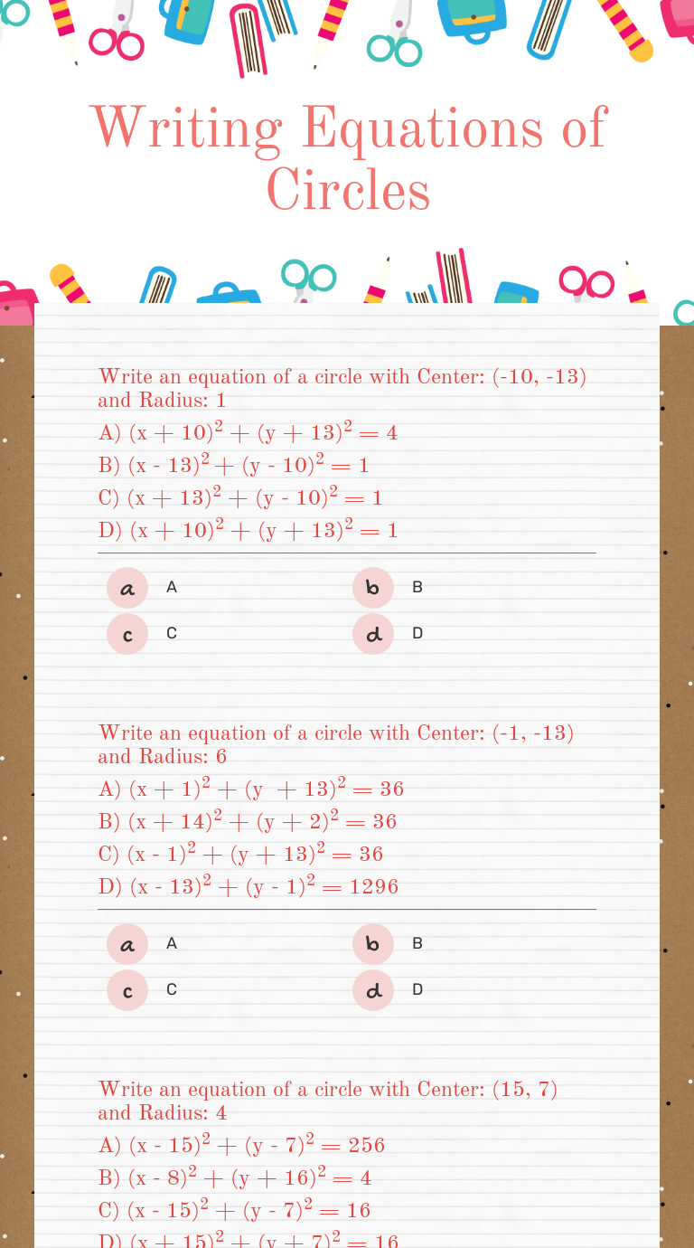 X h 2 y k 2 r 2.These are two worksheets on circle equations with step by step solutions.Circle equations worksheets teaching resources circle equations worksheets.
