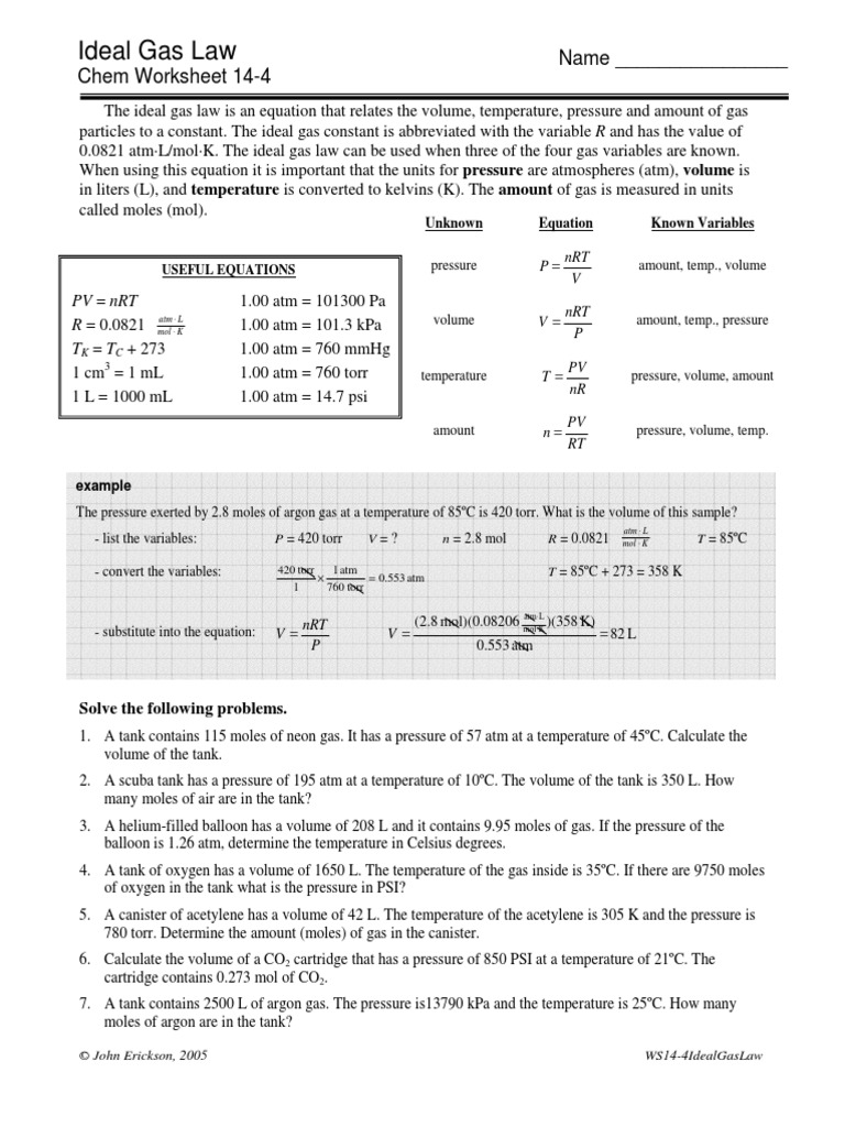 Gas Variables Worksheet Answers