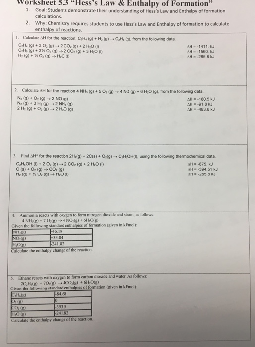 Kj mole c 2h 6 g 7 2 o 2 g 2 co 2 g 3 h 2o l h 1560.Hess law worksheets kiddy math hess law displaying top 8 worksheets found for this concept.A 505 g piece of.