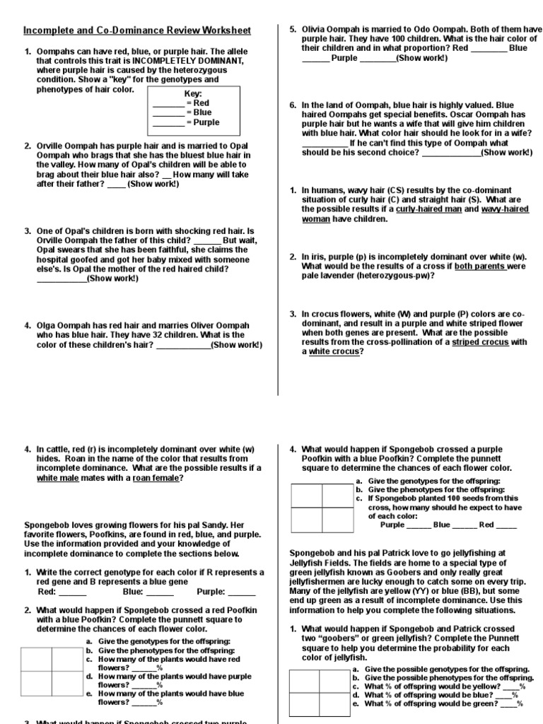 Provide a punnett square to support your answers where indicated.Incomplete and codominance worksheet mrs.Explain the difference between incomplete and codominance.