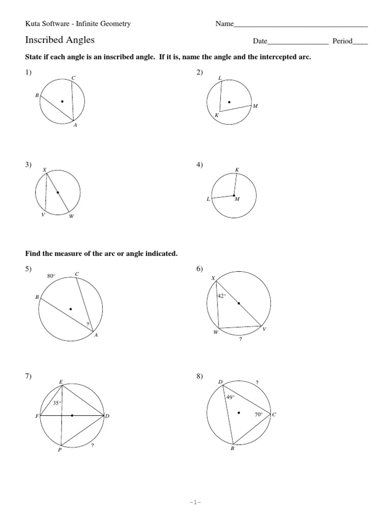 If an angle inside a circle intercepts a diameter then the angle has a measure of 90 circ.Inscribed angles date period kuta inscribed angles date period state if each angle is an inscribed angle.Worksheet will open in a new window.