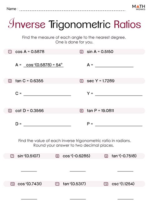 Inverse trigonometric functions worksheet.Identify the domain and range of each.Trigonometry worksheets math worksheets 4 kids inverse trigonometric function worksheets utilize this adequate supply of inverse trigonometric ratio worksheets to find the exact value of inverse trig ratios using charts and calculators find the measure of angles solve the equations learn to evaluate inverse and the composition of trigonometric functions and a lot more.If we know the size of an angle we can find the sin cos and tan of the angle by using a scientific calculator.