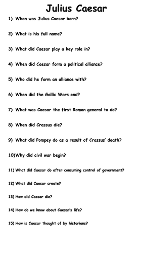 These are ready to use julius caesar worksheets that are perfect for teaching students about the gaius julius caesar known by his cognomen julius caesar who was born 12 or 13 july 100 b c.They need to read the text and then use it to answer the questions perfect for topic work on the romans and for practising reading and comprehension skills too.15 march 44 b c.