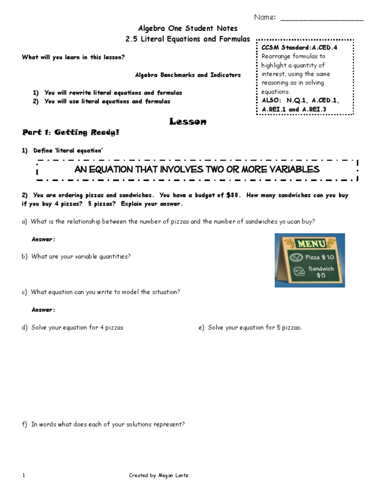 Literal equations worksheet 1 springfield public schools literal equations worksheet solve for the indicated variable in the parenthesis.Answers to literal equations worksheets kiddy math answers to literal equations.Kuta software infinite algebra 1.