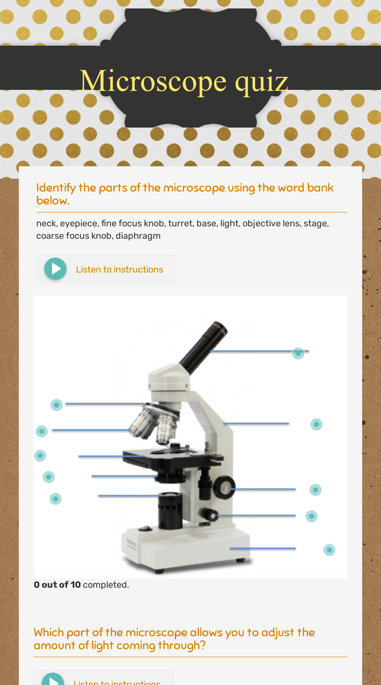 15 microscope parts a guide on their location and function a compound microscope consists of parts that assist in viewing with a naked eye a sample holder a magnifying lens and a light source.Microscope parts and use worksheet answer key with a school called home a view through the microscope identifying worksheet january 13 2018 we tried to locate some good of microscope parts and use worksheet answer key with a school called home a view through the microscope identifying image to suit your needs.Revolving nosepiece or turret.