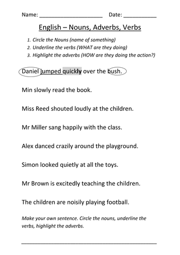 In these worksheets students have to recognize and identify individual nouns and verbs.Students identify whether the underlined word in the sentence is an adjective noun or verb.Noun worksheets for elementary school printable free.