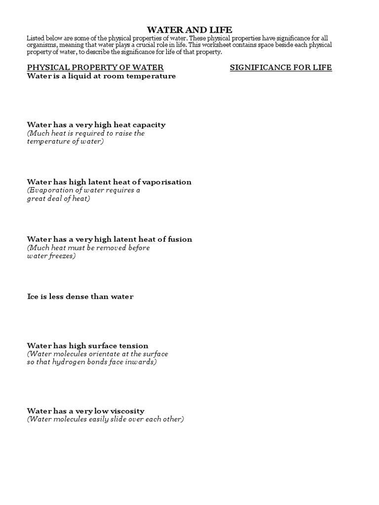 Properties Of Water Worksheet