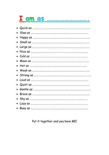 You often will find the use of the word as and or like with similes.In these worksheets students are asked to read sentences and determine if the sentence is a simile or a metaphor.Writing similes to describe people free.