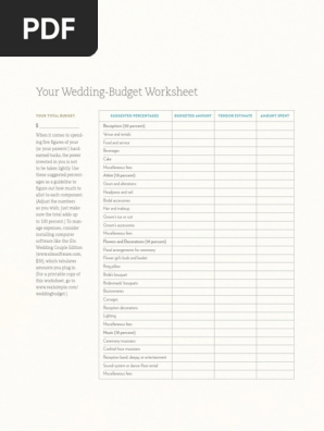 Wedding budget worksheet.When it comes to spend ing five figures of your or your parents hard earned bucks the power invested in you is not to be taken lightly.Your wedding budget worksheet real simple your wedding budget worksheet.Free wedding budget worksheet printable and easy to use the spreadsheet contains a wedding budget estimator tool that lets you specify your allowable budget amount and then adjust the percentage of the budget you want to allocate to the various categories such as apparel reception flowers etc.